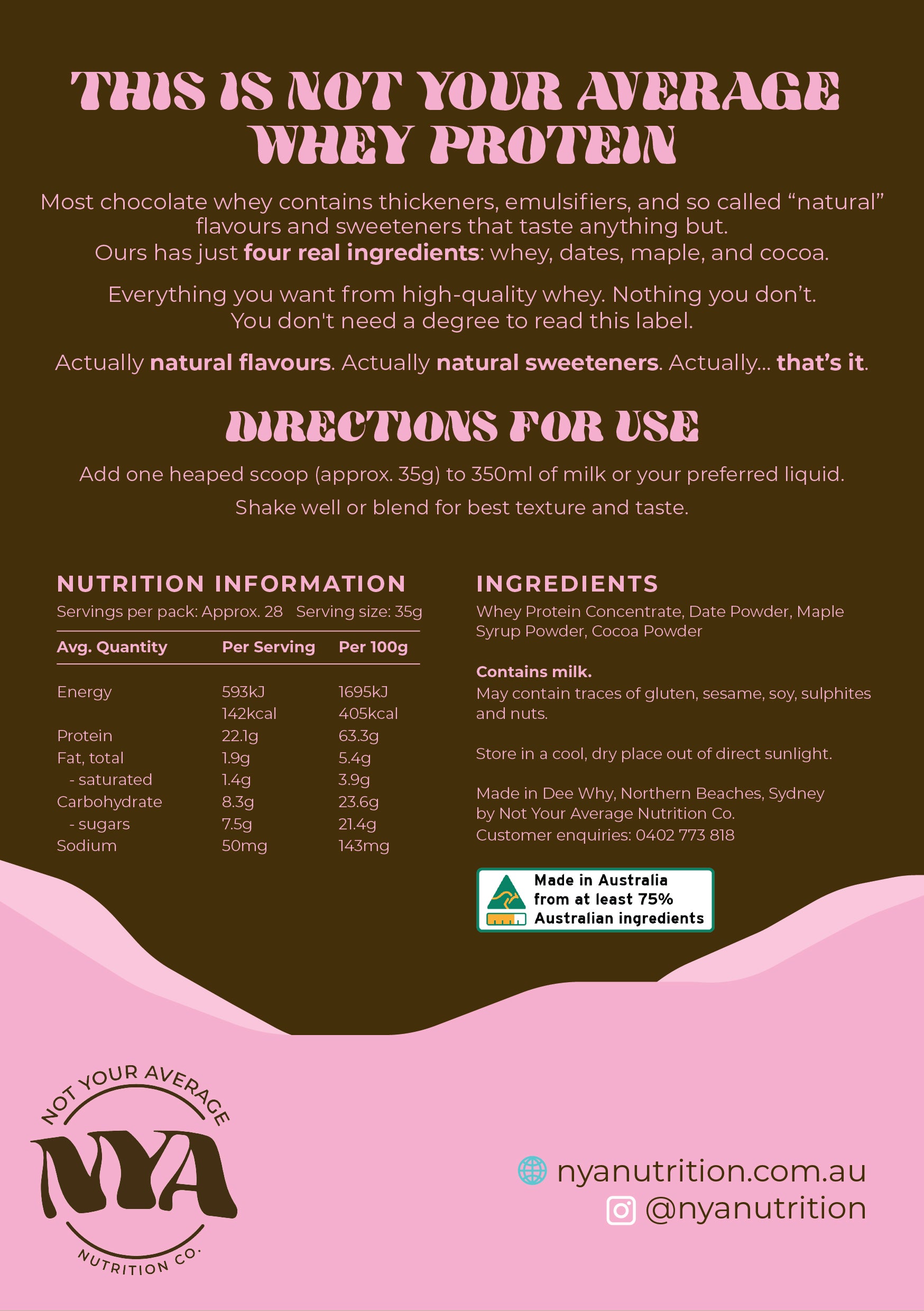 Most chocolate whey contains thickeners, emulsifiers, and so called “natural” flavours and sweeteners that taste anything but.