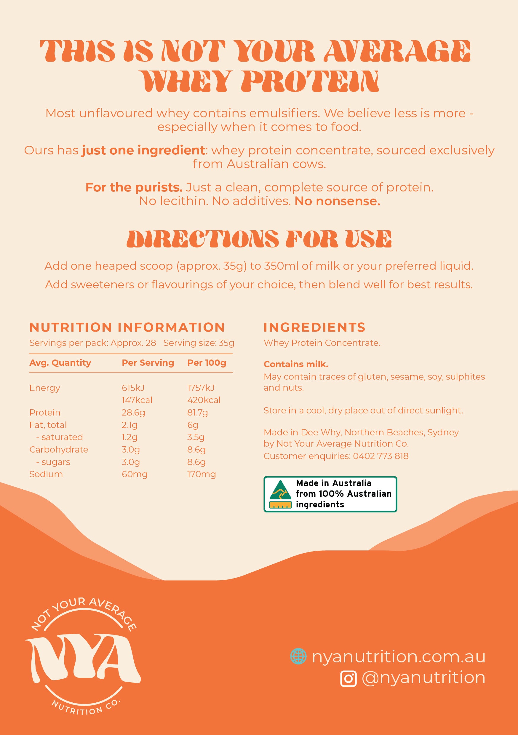(Already left this review on the NYA website, but I guess they prefer it done here, as it’s a ‘verified purchase’)… Really happy I can now buy a protein supplement fully sourced within Australia .... good safety-wise as well as for ‘patriotic' reasons. And also no other extra stuff in there to worry about, just the protein . Bought couple bags of the unflavoured Whey Protein concentrate - works great in my parent's daily home-made mochas.